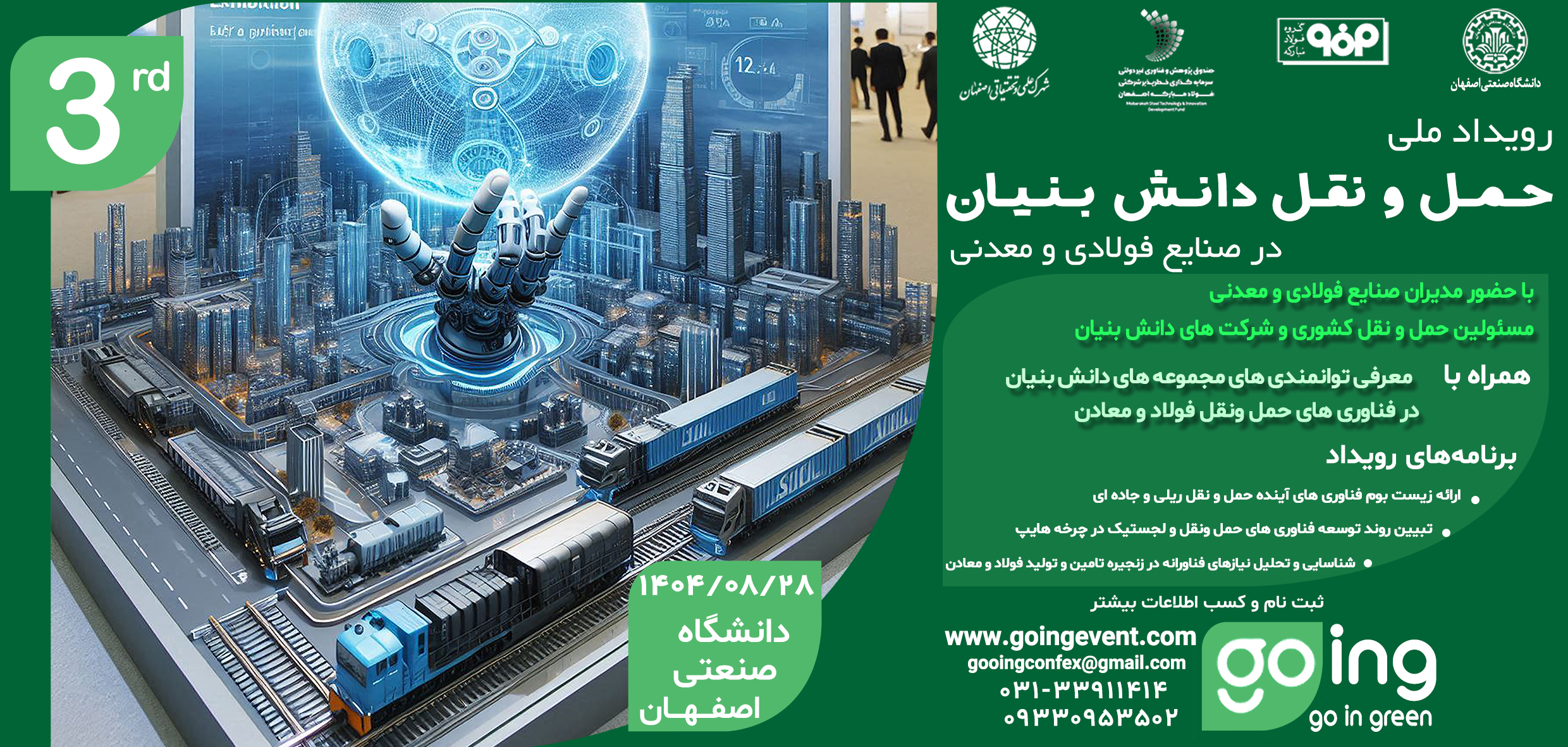 شرکت کنندگان عزیز می توانند با مراجعه به صفحه ابتدای سایت به آدرس www.goingevent.com با کلیک بر روی دکمه “شرکت در رویداد حمل و نقل دانش بنیان در صنایع فولادی و معدنی” نسبت به ثبت نام در این رویداد اقدام نمایند. مکان برگزاری رویداد نیز در دانشگاه صنعتی اصفهان است.